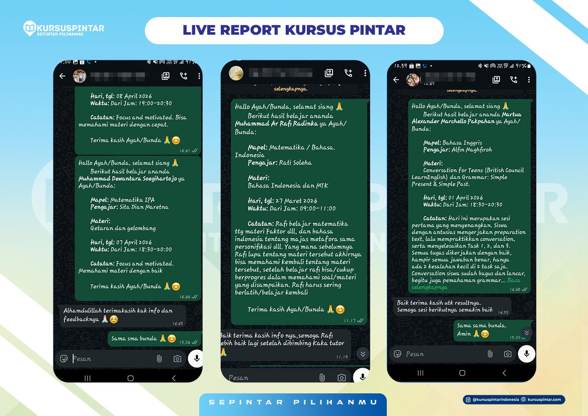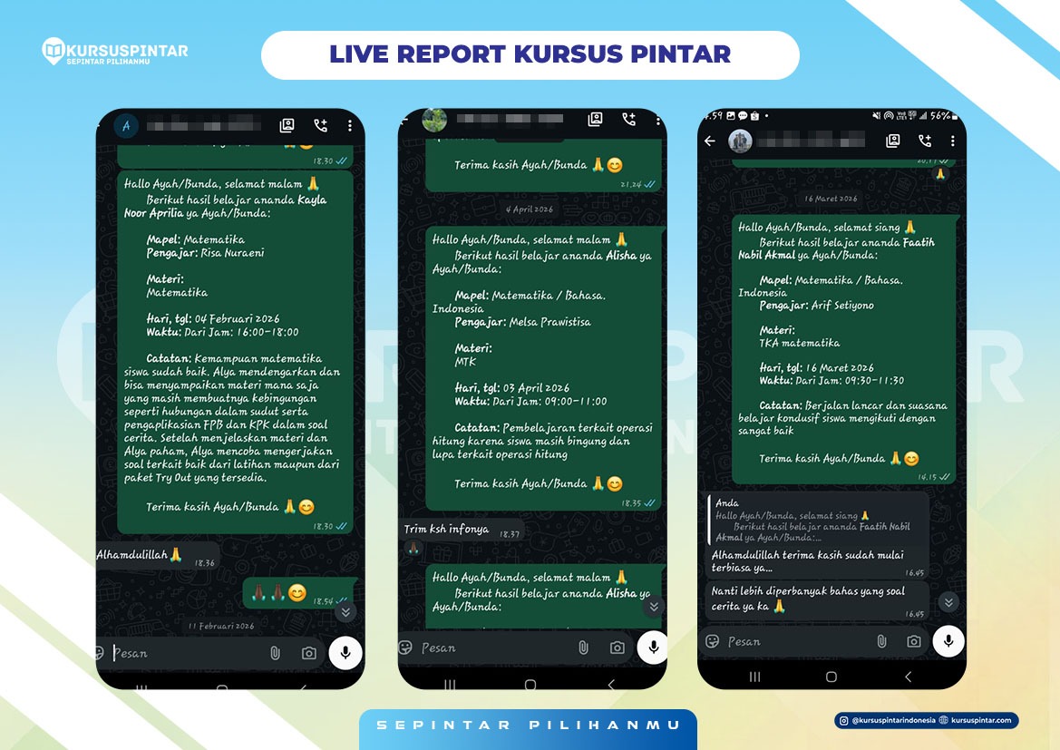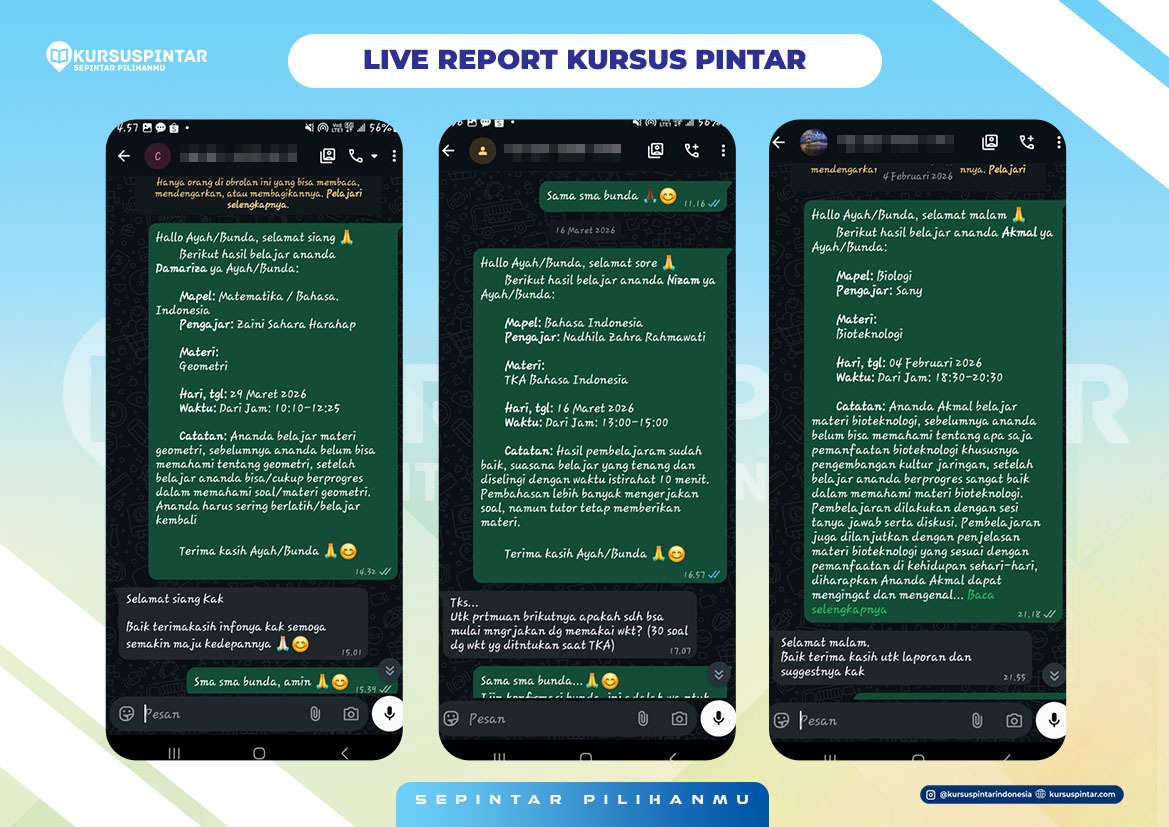 Kursuspintar menyediakan sistem live report di mana orang tua siswa akan langsung menerima laporan perkembangan setelah siswa belajar. Orang tua siswa akan tahu anaknya belajar apa saja dan sudah mengalami perkembangan apa saja. Siswa juga bisa memberi rating guru dan mengetahui jadwal belajarnya di kemudian hari.